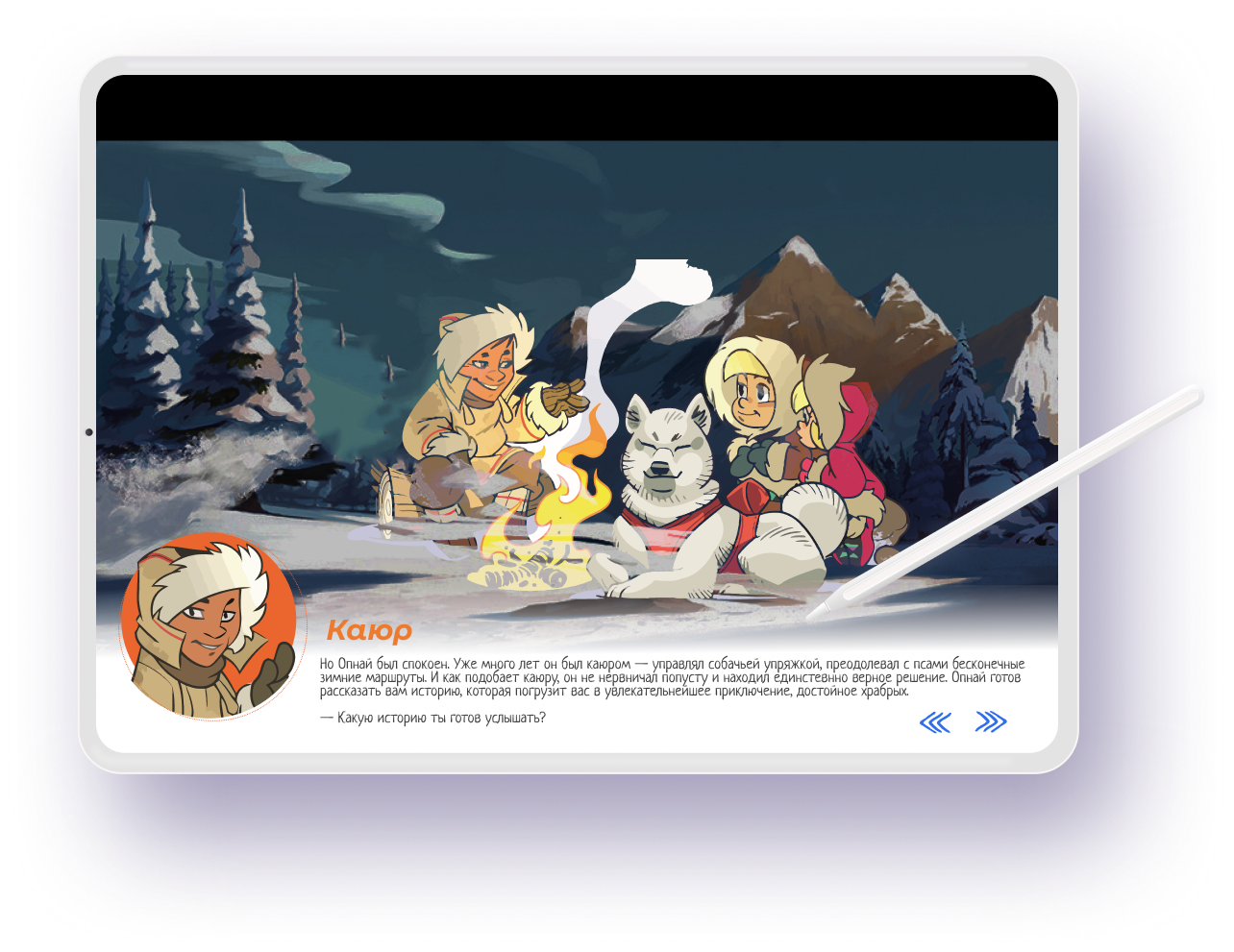 Каюр рассказывает вам свою историю, и вы постепенно погружаетесь в мир Берингии, переключая самостоятельно весь диалог